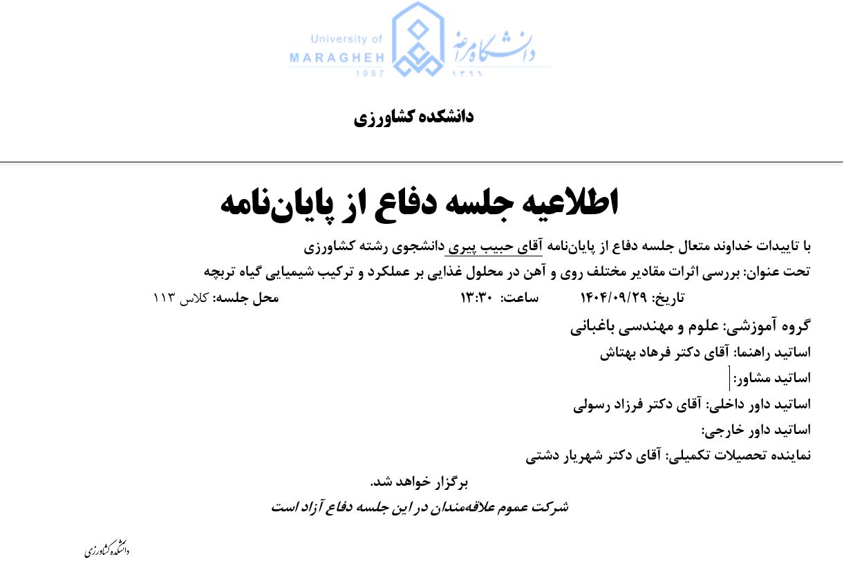 جلسه دفاع از پایان نامه، گروه مهندسی باغبانی (زمان دفاع: شنبه، 29 آذر 1404) - دانشکده مهندسی کشاورزی دانشگاه مراغه